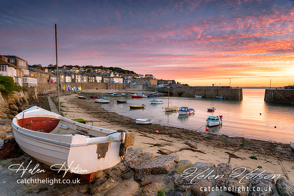 Sunrise over boats in the harbour at Mousehole near Penzance on the Cornwall coast.